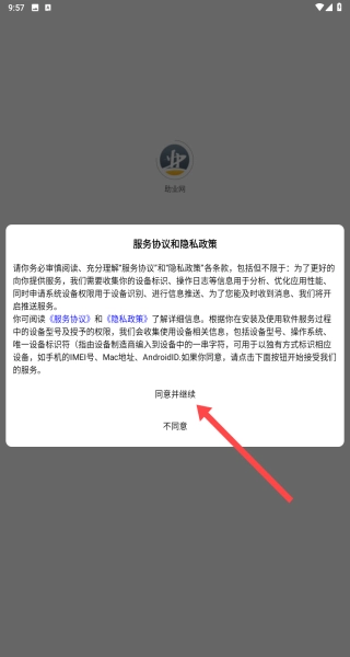 弹出服务协议与隐私政策的弹窗,向用户说明信息收集的用途,用户点击同意并继续接受相关条款后,即可进入应用的主界面。
