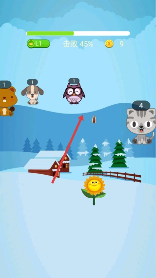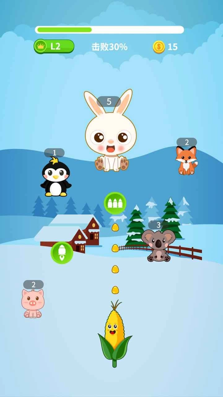在移动过程中,通过操控角色的移动来攻击上方的小动物,以此获取分数,进而推动上方进度条的增长。