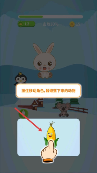 游戏开始后,按照提示操作:按住屏幕里的玉米角色,用滑动屏幕的方式控制它移动,躲开从上方掉下来的动物,别让角色受伤。