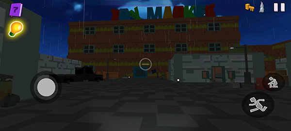 3、进入一个陌生的地方,到处都透露着废弃和被烧毁,左下角按钮控制移动观察四周,右侧是下蹲潜行和奔跑;
