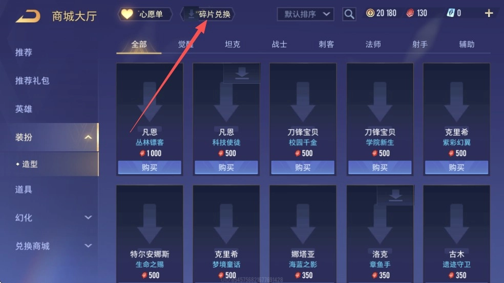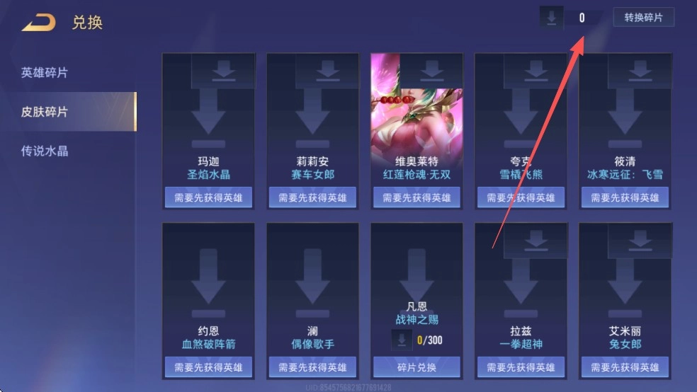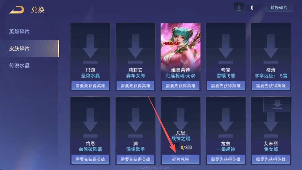 用碎片兑换皮肤的前提是你拥有对应的英雄,同时还要有足够数量的碎片。