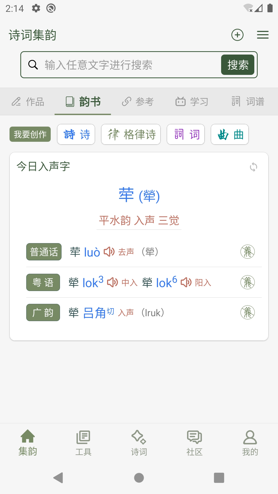 诗词集韵是一款专为诗词学习打造的软件,收录了十万余首诗词,支持用户自由解锁学习、鉴赏与理解功能,助力深入掌握诗词内容。软件具备强大的查询与搜索能力,还了康熙字典、古汉语字典等实用工具书,是诗词爱好者学习与创作的必备工具。此外,软件提供普通话、粤语、广韵等读音对照,方便用户学习;同时具备诗词检测功能,可帮助用户了解诗词的韵律与平仄,感兴趣的用户不妨前来体验。