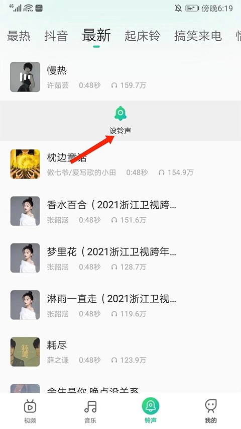 进入铃声界面后,你可以看到涵盖最热、抖音、最新、起床铃、搞笑来电等多种风格的铃声。
