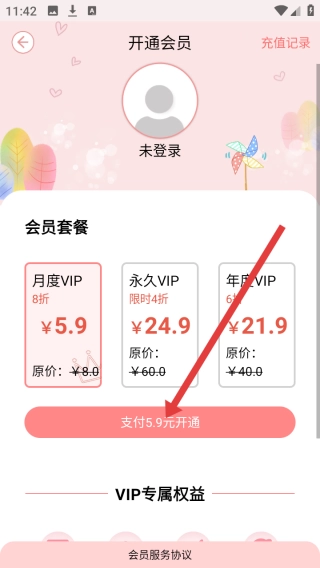 开通会员页面呈现未登录状态,清晰罗列月度、永久、年卡等VIP套餐及对应的折扣价格;粉色支付按钮十分醒目,按钮下方标注着VIP专属权益,以此引导用户开通会员,畅享各项特权。