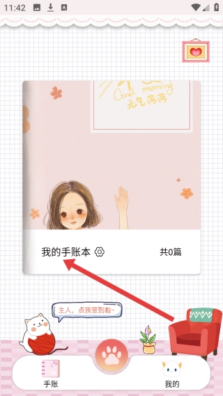 手账页采用粉色作为主色调,展示手账本封面;在“我的手账本”标题下方标注“共0篇”,并以可爱猫咪等元素作为装饰点缀;底部设置“手账”和“我的”两个导航选项,整体营造出温馨的记录氛围。