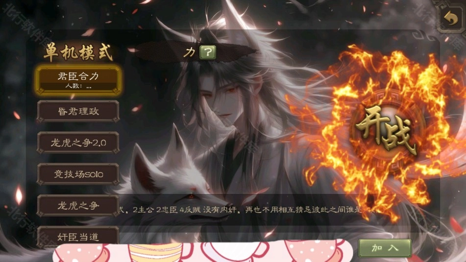 3、游戏包含君臣之力、昏君理政、龙虎之争2.0、竞技场solo等多种玩法模式,这些均为单机模式,无需网络即可开启游玩!