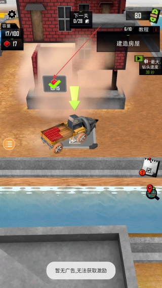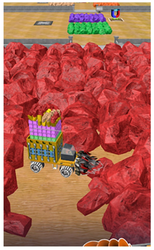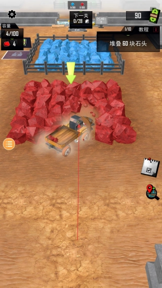 滑动屏幕操控卡车驶向红矿石堆,依照箭头提示进行采矿操作,达成“堆叠60块石头”的任务目标。