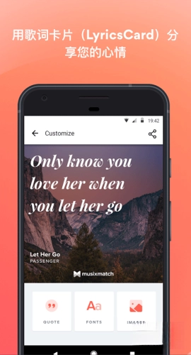 musixmatch安卓版是一款专业的音乐播放应用,拥有海量音乐资源可供聆听,每日更新最新歌曲,让用户始终紧跟潮流;其智能识别功能能精准识别其他歌词,助力用户获取歌曲信息,此外还支持多平台资源同步,实现无缝衔接。
