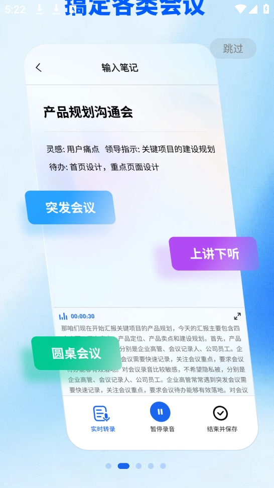 圆桌会议涵盖三大核心会议场景,为您打造更便捷、高效、专业且可随身携带的智能会议助手。