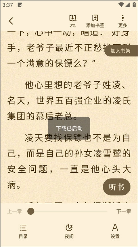 在阅读小说时,若遇到精彩的故事内容,可借助添加书签的功能对相应章节进行标记。