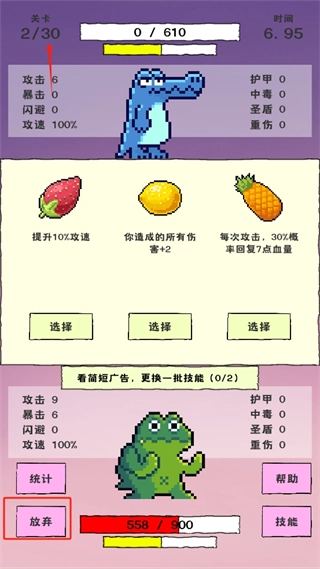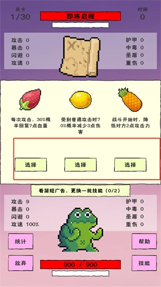 《我选技闯关》是一款像素风的休闲文字冒险战斗游戏。玩家将化身为Q萌可爱的青蛙角色开启闯关之旅,通过挑选不同种类的水果来获得各异的战斗效果。游戏采用全自动战斗模式,玩家无需手动操作战斗,只需规划合理的养成策略,就能畅享畅快的闯关体验。在1.9版本中,游戏提供了丰富多样、带有不同能力增幅效果的水果供玩家提升战力;若遇到卡关的情况,还可以通过观看简短广告免费获取水果,助力增强实力。