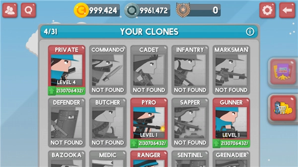 当玩家在战斗中失败死亡,且拥有足够数量的蓝色方块时,便能解锁新的兵种;解锁所需的蓝色方块数量越多,对应的兵种攻击力也就越强。