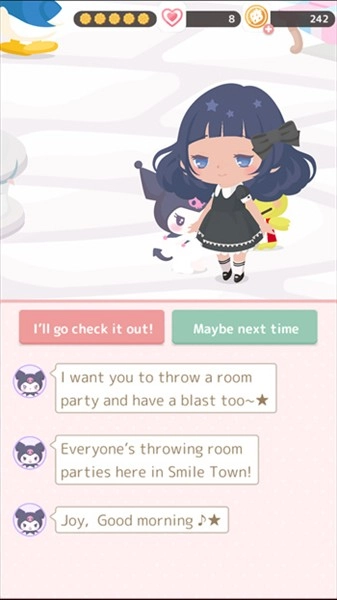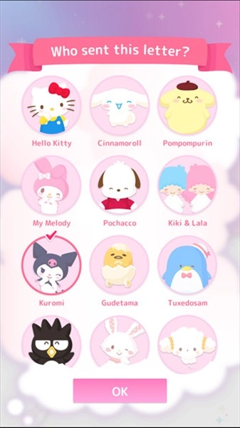 进入游戏后,玩家会先收到一封信,之后便能选择来自哪位三丽鸥明星朋友的邀请,同时还可以设定自己的名字与形象。