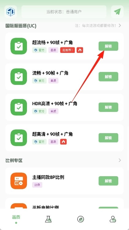 5、点击“解锁”按钮,将所选的画质方案应用到游戏中