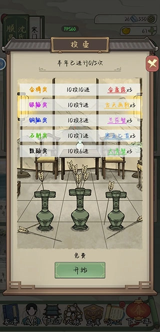 家族势力满10开放投壶(投壶每年免费一次就好,没必要投入大量元宝去投壶,5次投壶都不中的几率太大了)。
