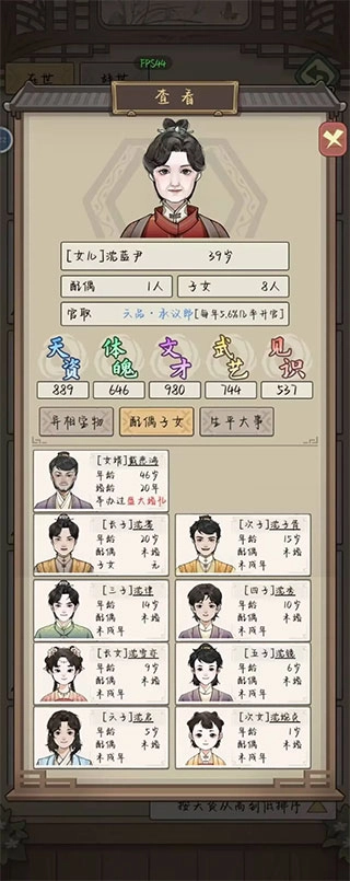 选择随自己姓后的角色无论男女出生子女都是随自己姓,开局人物属性,推荐选择比较中和一点的。天资60-70左右。