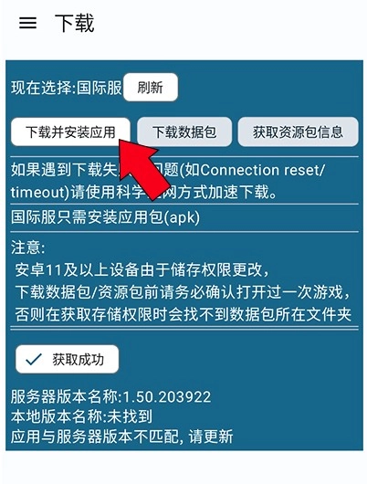 2、等待页面下方显示数据获取成功后,点击【并安装应用】,自动完成APK的与安装。