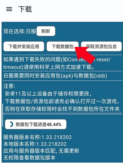 8、再次点击【数据包】,系统会开始自动安装OBB文件,等安装完成后就能正常启动游戏了。