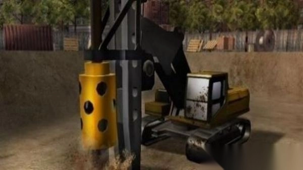 画面中呈现黄色挖掘机与操作按钮,模拟操控挖掘机开展施工的场景,玩家能够借助界面按钮,操控挖掘机完成挖掘等各类任务。