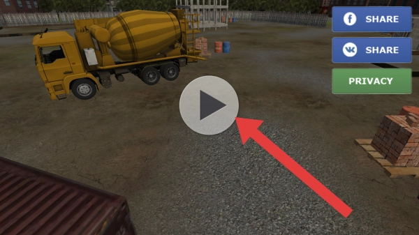画面里的黄色搅拌车(混凝土搅拌车)、标有“SHARE”和“PRIVACY”的按钮,还有播放按钮,从呈现的内容来看,这是和工程车辆操作有关的模拟场景,玩家需要操控搅拌车去完成施工任务。