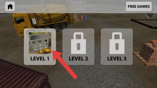 左上角的“房子”图标用于返回主页,右上角设有“FREEGAMES”标识;游戏采用关卡解锁机制,玩家能从LEVEL1起开启驾驶搅拌车完成施工任务等体验。