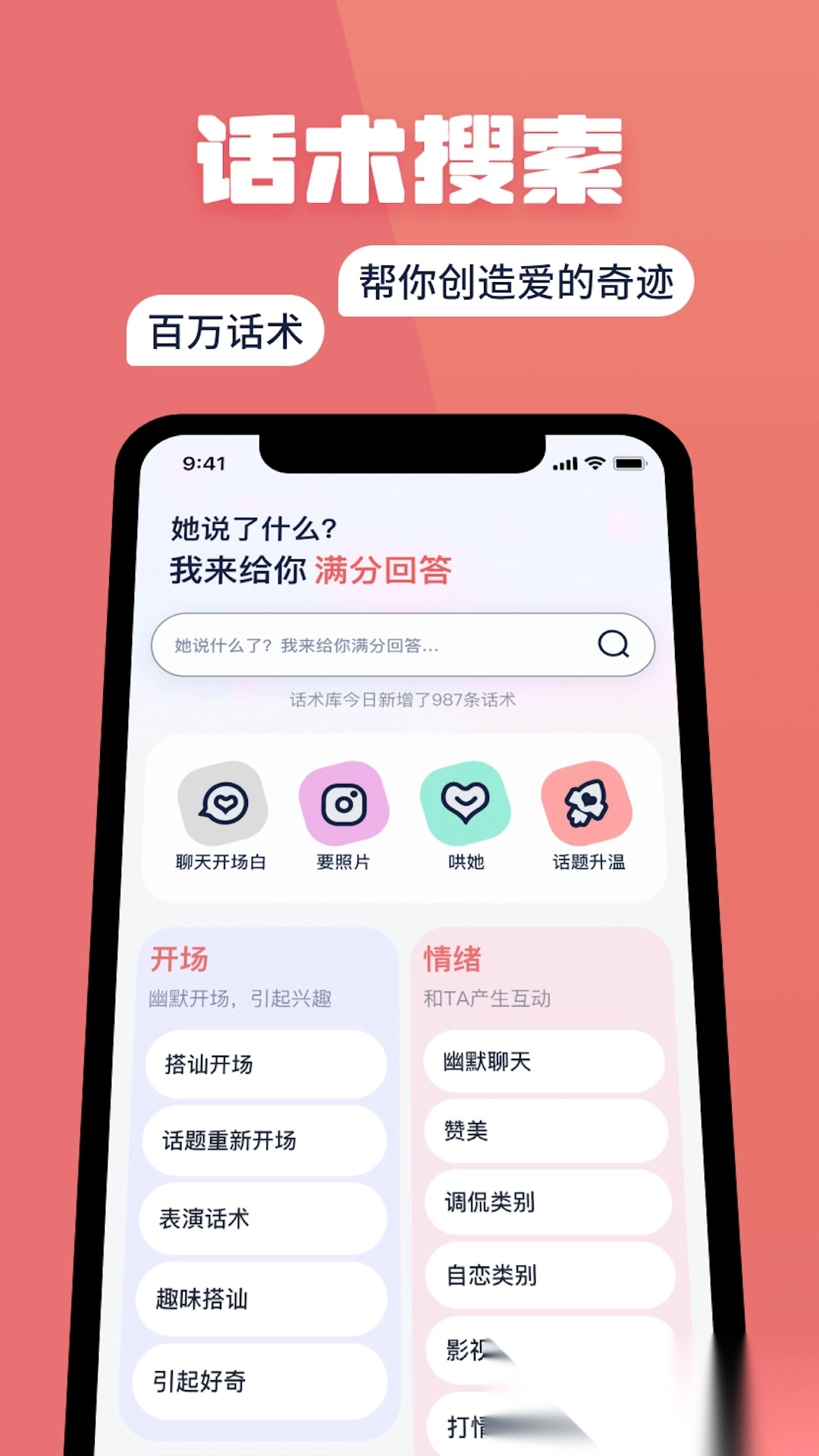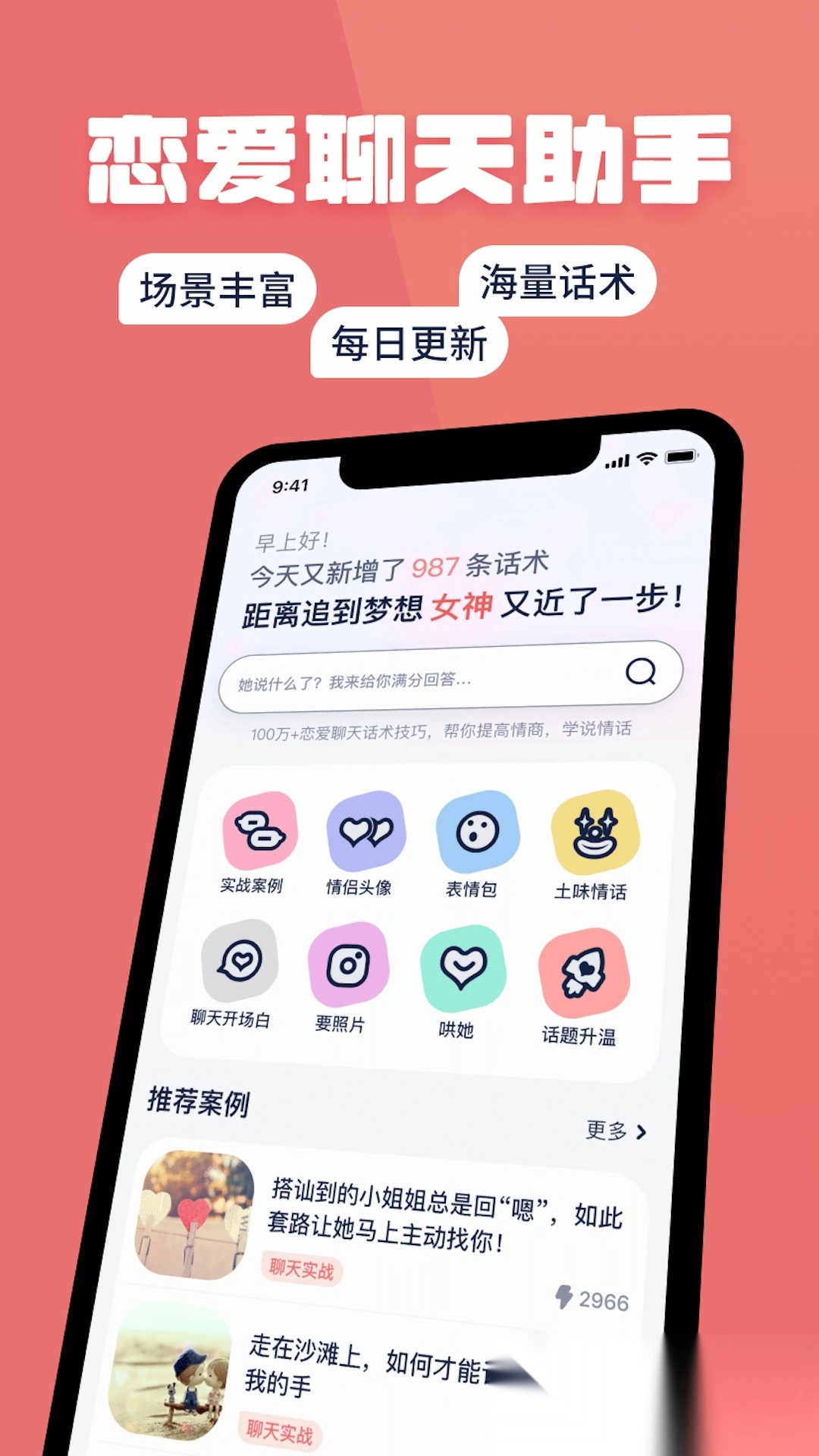 这是一款十分贴心的聊天工具,里面包含了海量可搜索的恋爱对话内容,还有各种实用模式以及可供参考的模板。
