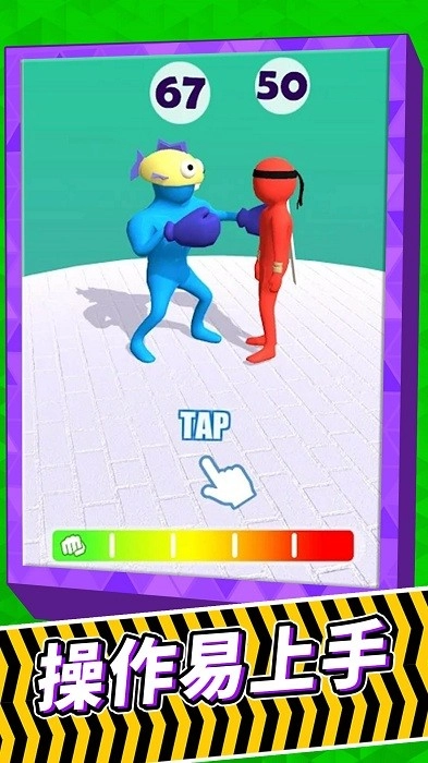 当画面中出现绿色和红色小人时,需依照红箭头的指引,点击攻击力为5的绿色小人去攻击红色小人;而当底部的能量条达到满格状态时,就可以点击出拳了。
