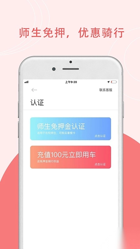 师生完成认证后可免押金用车,认证通过立即开启骑行;