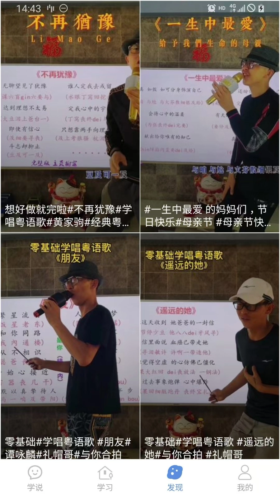 在粤语歌页面,挑选歌曲后点击“跟唱”功能,就能对照歌词练习发音了。