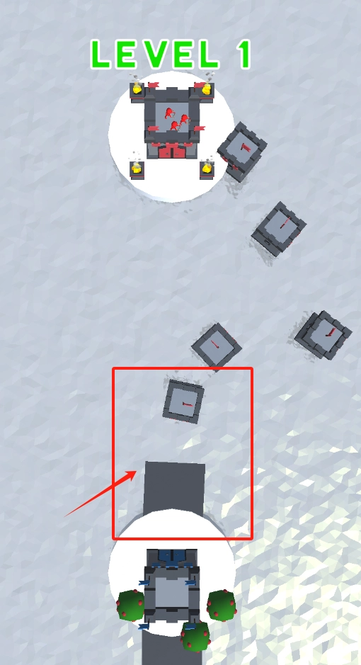 你看看上下两个基地,还有红色箭头指向的方块,点击那个被框起来的红色方块,就能放置防御塔来守护家园啦。