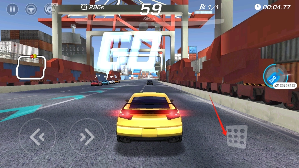 在游戏的起步界面,先做好准备工作,接着点击右侧的按钮,就能让黄色赛车在港口赛道上顺利起步,从而开启这场竞速之旅。