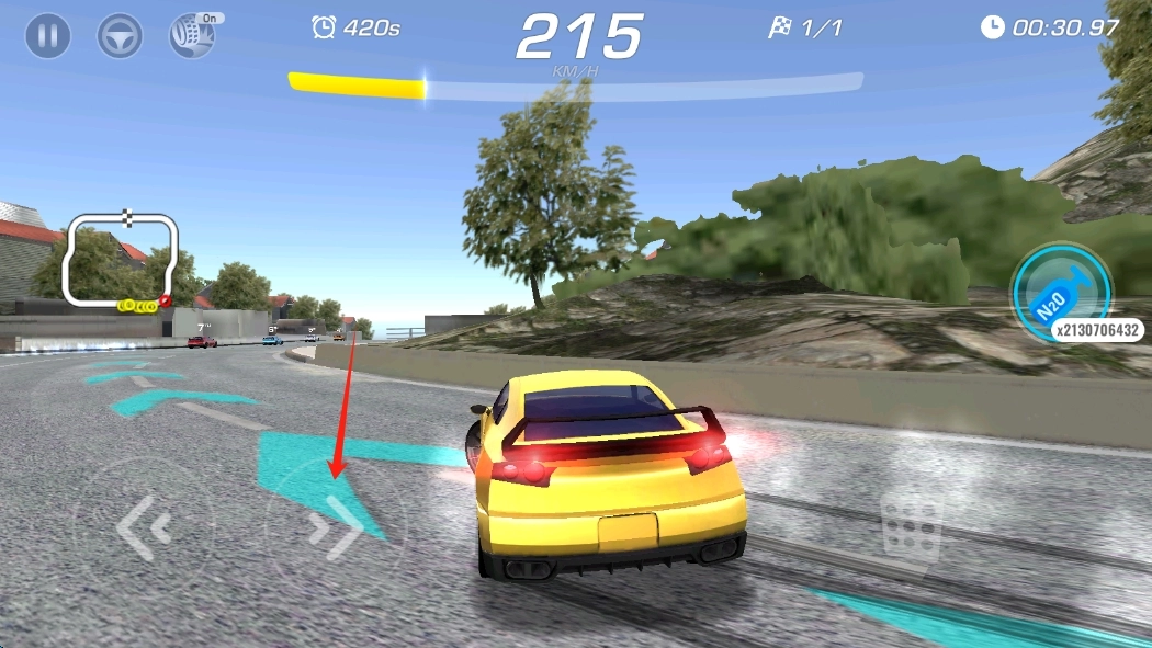 在赛道上驾驶时,点击左边的方向按钮,灵活操控赛车的行驶方向,避开各种障碍,超过其他对手,让速度持续提升。