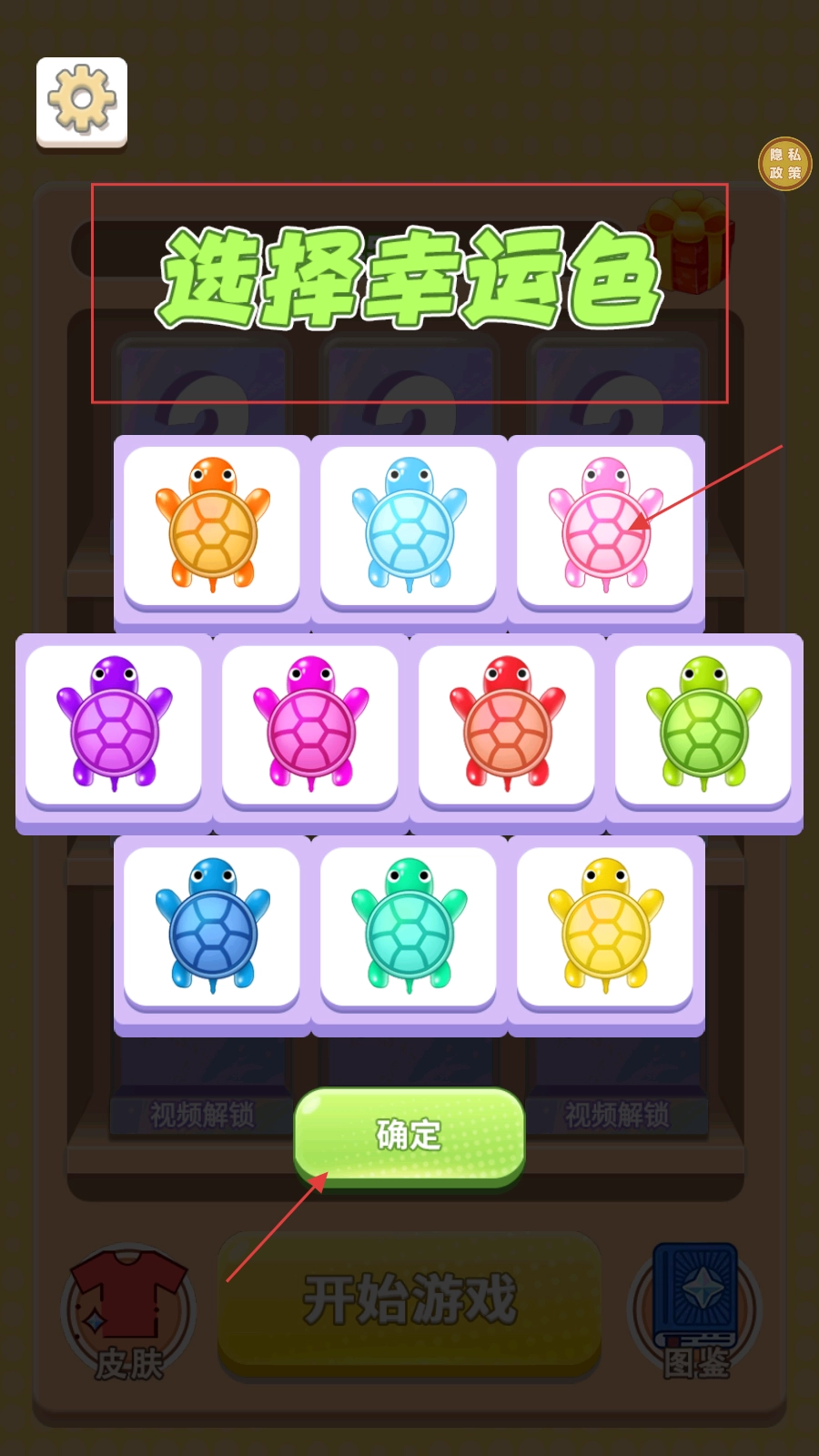 在【选择幸运色】的界面里,挑选你喜欢的乌龟颜色,点击【确定】按钮就能进入游戏啦。