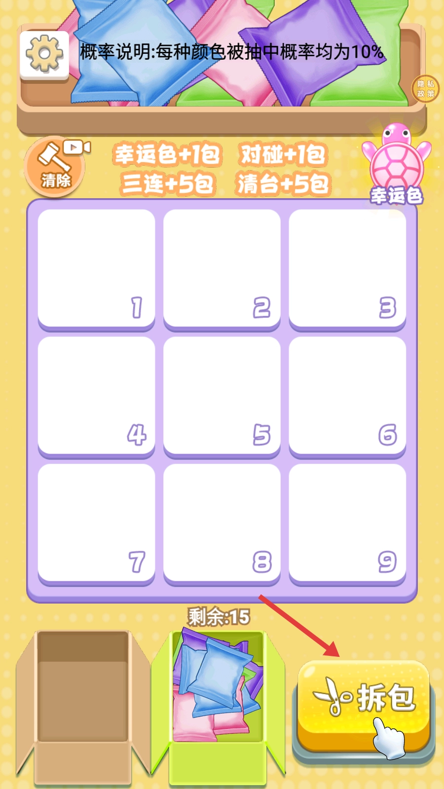 现在进入拆包环节啦,点击【拆包】按钮就能打开彩色礼包,然后把里面的内容填充到九宫格里就好啦。