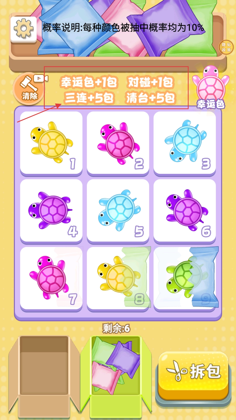 对对碰消除玩法:引导相邻的相同乌龟进行碰撞即可消除,消除的乌龟数量越多,能获得的奖励就越丰厚,这些奖励可以积累成资源,用来抽取更多盲盒。