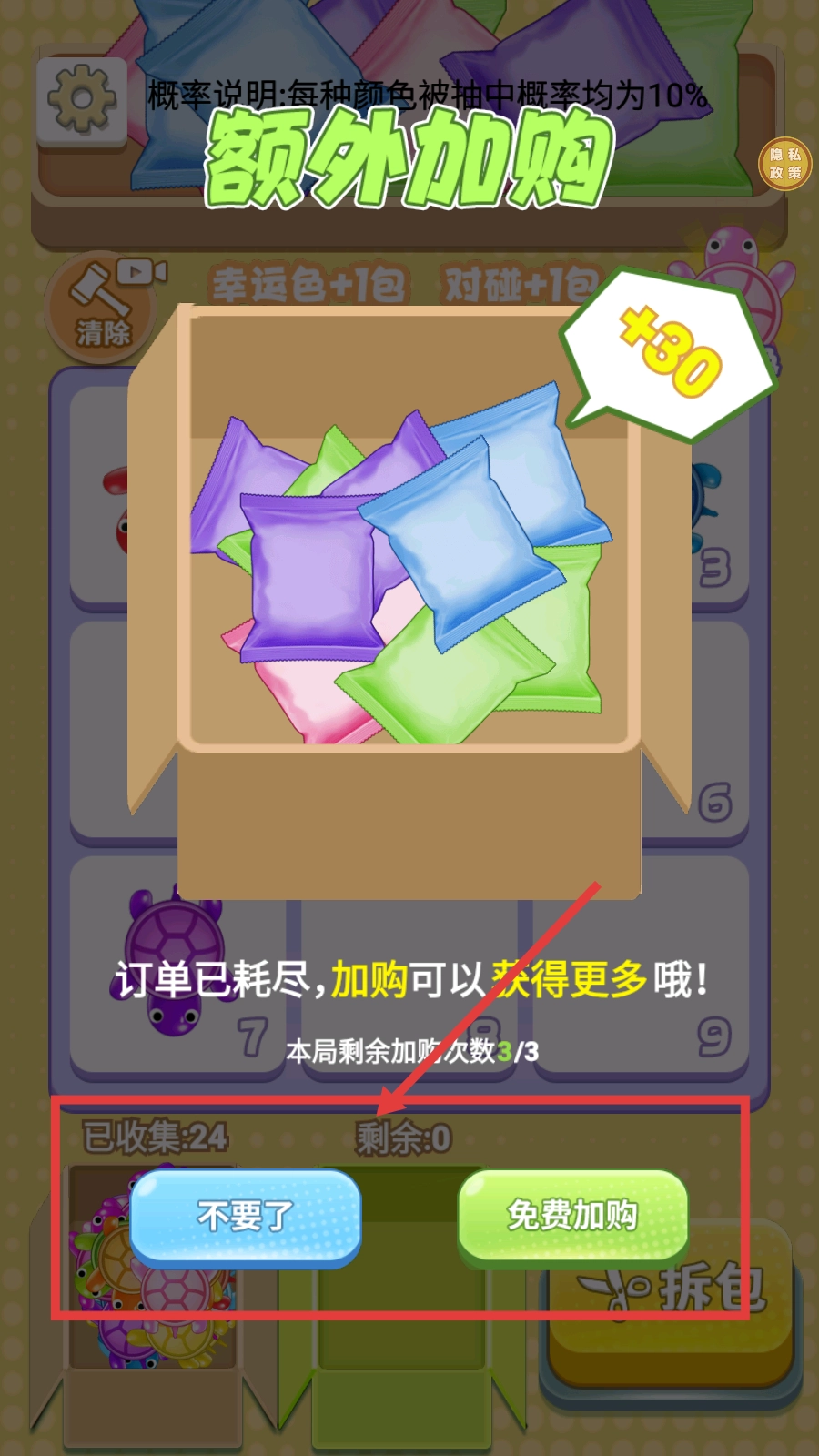 订单领取完毕后,您可以选择【免费加购】来获取更多礼包,也可以点击【不要了】结束当前流程。