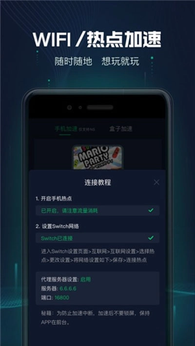 确认Switch已连接到手机热点,当弹窗显示“Switch已连接”时,就说明加速成功了。