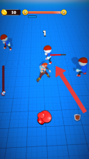 2、金币显示为“50”,上方有进度条(等级1-2),数字“1”代表波数或敌人计数,展示了一个战斗场景,玩家角色与多个敌人在蓝色网格的场地上对战。