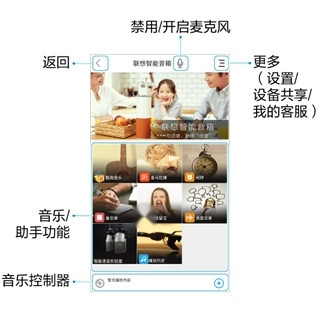 完成初始设置后,在设备界面点击联想音箱MINI可以进入音箱首页界面,搜索音乐 、辅助助手功能、进入音箱设置菜单等。