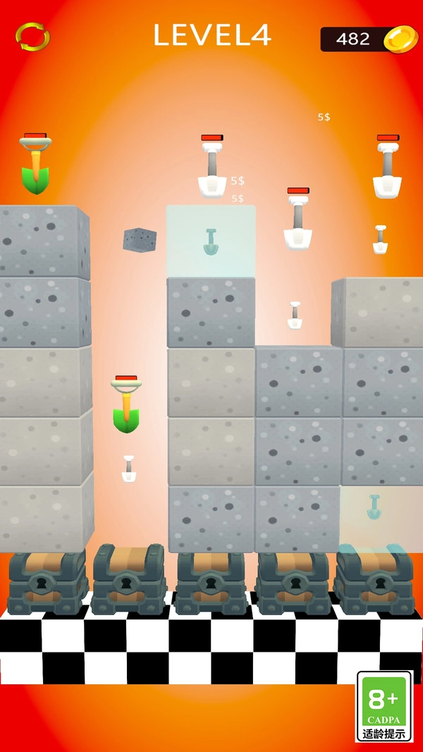 进入对应的关卡后,操控铲子开展挖掘动作,在场景里搜寻隐藏的宝藏,像金币、通关钥匙这类关键物品都包含在内。