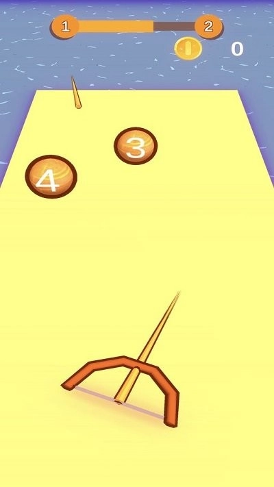 使用橙色弹弓装置瞄准黄色平台上的数字圆球。按照红色箭头指示的方向发射箭矢,过程中留意顶部的进度条与金币显示,保证能够精准击中目标。