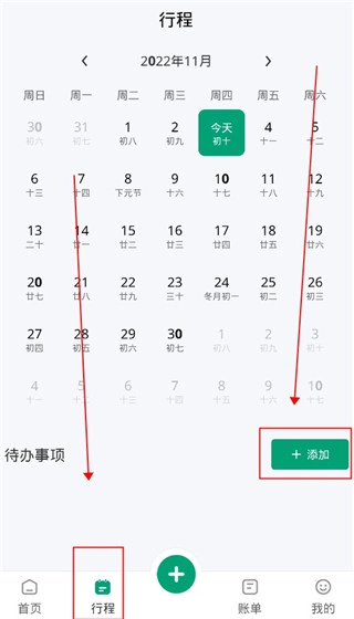 我们点击行程,在这里点击添加,就能把后续重要的事情记录进去,到了时间软件会自动提醒你。