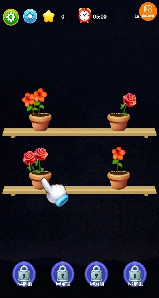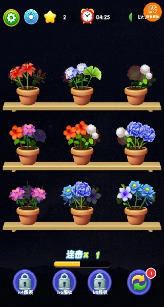 每个关卡都有90秒的倒计时,玩家需要快速找出屏幕上颜色和形状都相同的花朵,将它们配对以完成消除。