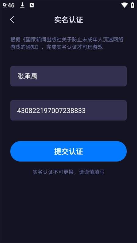 接下来,我们要输入自己的姓名和身份证号来完成实名认证,不然就没办法正常使用。