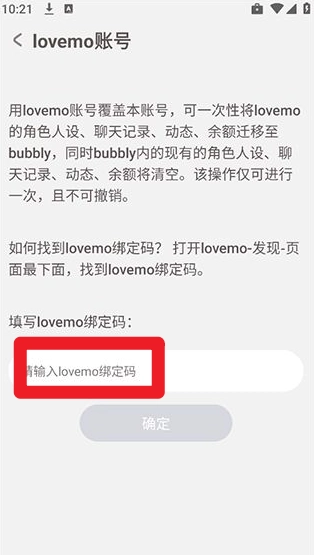 4、使用lovemo账号覆盖当前账号,能够一次性把lovemo的角色人设、聊天记录、动态、余额转移到bubbly,与此同时bubbly里现有的角色人设、聊天记录、动态、余额会被清空。此操作仅允许执行一次,并且无法撤销。