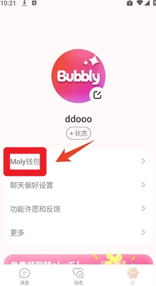 5、接下来就能在Bubbly里查看同步过来的Moly钱包,还有AI角色信息。