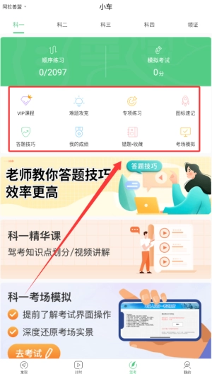 内容筛选:根据自身实际需求,选择科目一、科目四或者实际路考培训模块,开启对应的学习计划。