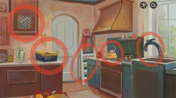 5、在厨房拿取火柴、梯子和水壶,利用梯子完成顶柜的一笔画游戏拿到扳手修水龙头,再烧水完成解谜。