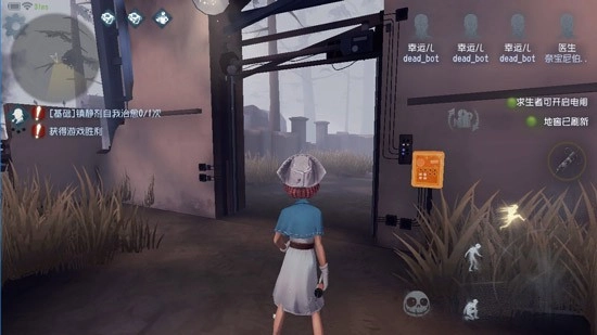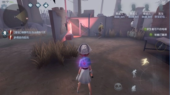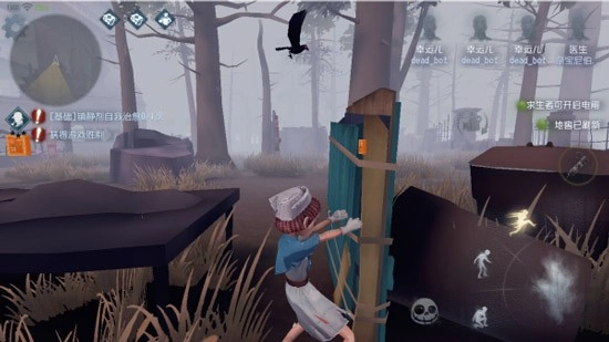 在确认屠夫没有发现你时,可以尝试蹲下躲在障碍物后面,根据屠夫的视野进行轻微的位置调整。蹲下、轻声走动和奔跑这三种状态可以通过右侧的按钮来切换。当处于奔跑状态时,监管者能够看到几秒前留下的脚印,而且在奔跑状态下进行板窗交互时,也会给监管者发送位置提示。