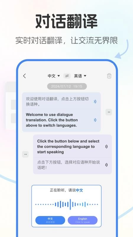 提供对话翻译工具,能够实时聆听对方讲话并进行翻译,翻译结果可直接查看。